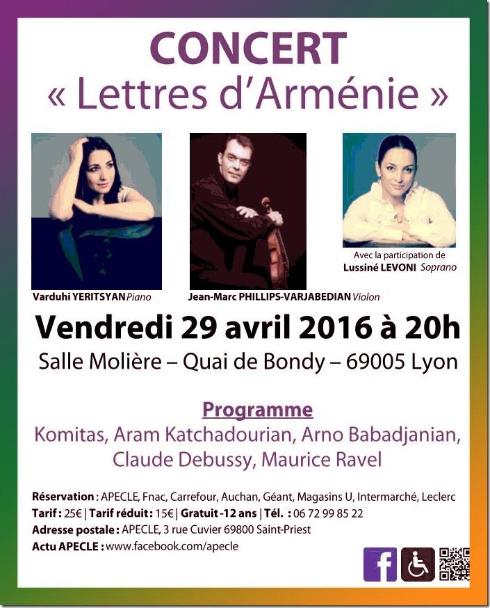ARCHIVES Debussy, Ravel, Katchadourian, Komitas, Babadjanian à Lyon salle Molière avec l’APECLE , vendredi 29 avril 20heures Raffi March 15th, 2016 APECLEaramArnoassociationBabadjanianclaudeconcertcultureDebussyeuropefranceKatchaturianKhatchadouriankhtcatourianle mondeMauriceMauriecravelspectacle Vendredi 29 avril 2016 à 20 heures salle Molière à Lyon : Claude Debussy , Maurice Ravel, Aram Khatchadourian , Arno Babadjanian, Komitas avec l'association APECLE Suivez-nous !