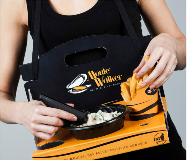C'est ça le concept : "moule-walker", manger dans un stade , un festival, sur un banc, même en marchant… Sur le plateau, une cassolette de 180 g de moules décortiquées avec 'une sauce (crème, marinière, curry champignons…), un cornet de frites et un verre de vin operculé ou une boisson non alcoolisée = entre 9,50 et 11,50 €.