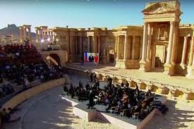 Moins de deux mois après la libération de Palmyre en Syrie , l'orchestre symphonique de St Pétersbourg a joué dans les ruines devant la population, des journalistes ,des soldats russes, des enfants .. . Un symbole fort .