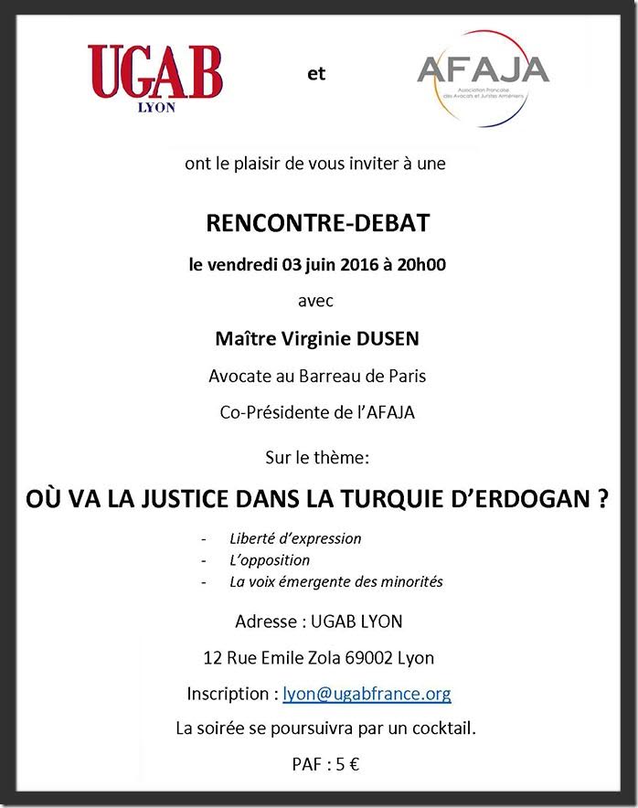 ARCHIVES “Où va la justice dans la Turquie d’Erdogan” Raffi May 31st, 2016 Une passionnante rencontre-débat à Lyon (69) avec Maître Virginie Dusen , avocate au barreau de Paris , co-présidente de l'AFAJA . dans les salons de l'UGAB Lyon , vendredi 03 Juin 2016 à 20h 12 rue Emile Zola 69002 Lyon Suivez-nous !