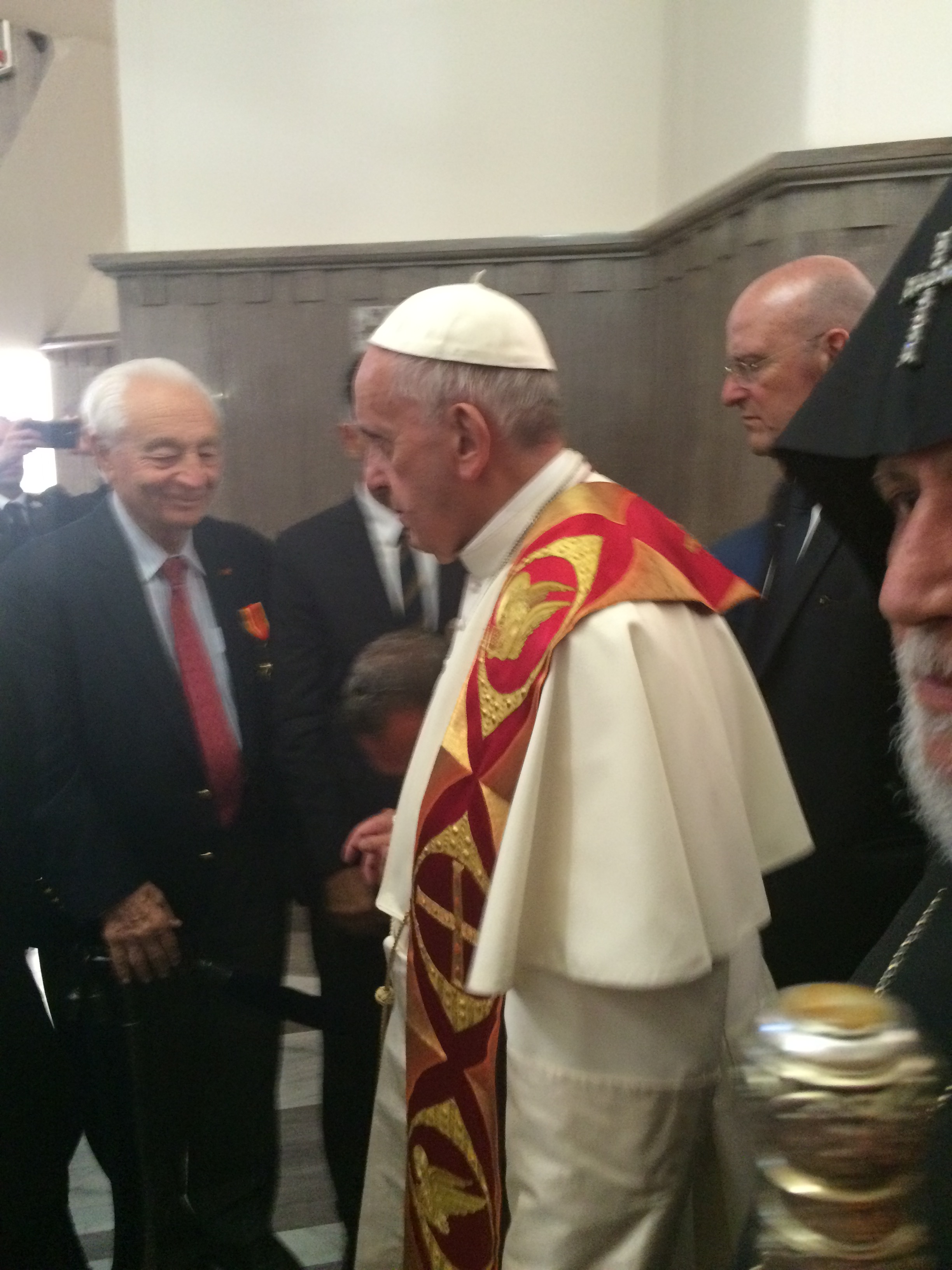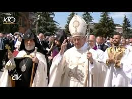 Nous sommes conduits au 1er rang , grâce à l'intervention de Mgr Raphael Minassian . Les photographes (dont Max Sivaslian de NAM et Vahé Der-Minassian qui écrit aussi dans l'Express) , et caméramen , sont en ligne au pied des marches de tapis rouge: le Pape François arrive à 11h pile précédé des dignitaires des deux Eglises : catholique et apostolique arménienne .