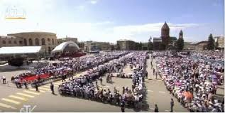 le lendemain à 9heures nous partons en voiture vers la place , pour la messe en plein air du Pape. Nous devons nous arrêter à quelques centaines de mètres et continuer à pied : la police a barré toutes les voies d'accès . Gendarmerie (Vostiganoutioun) , Police , et services secrets ,cernent la place .