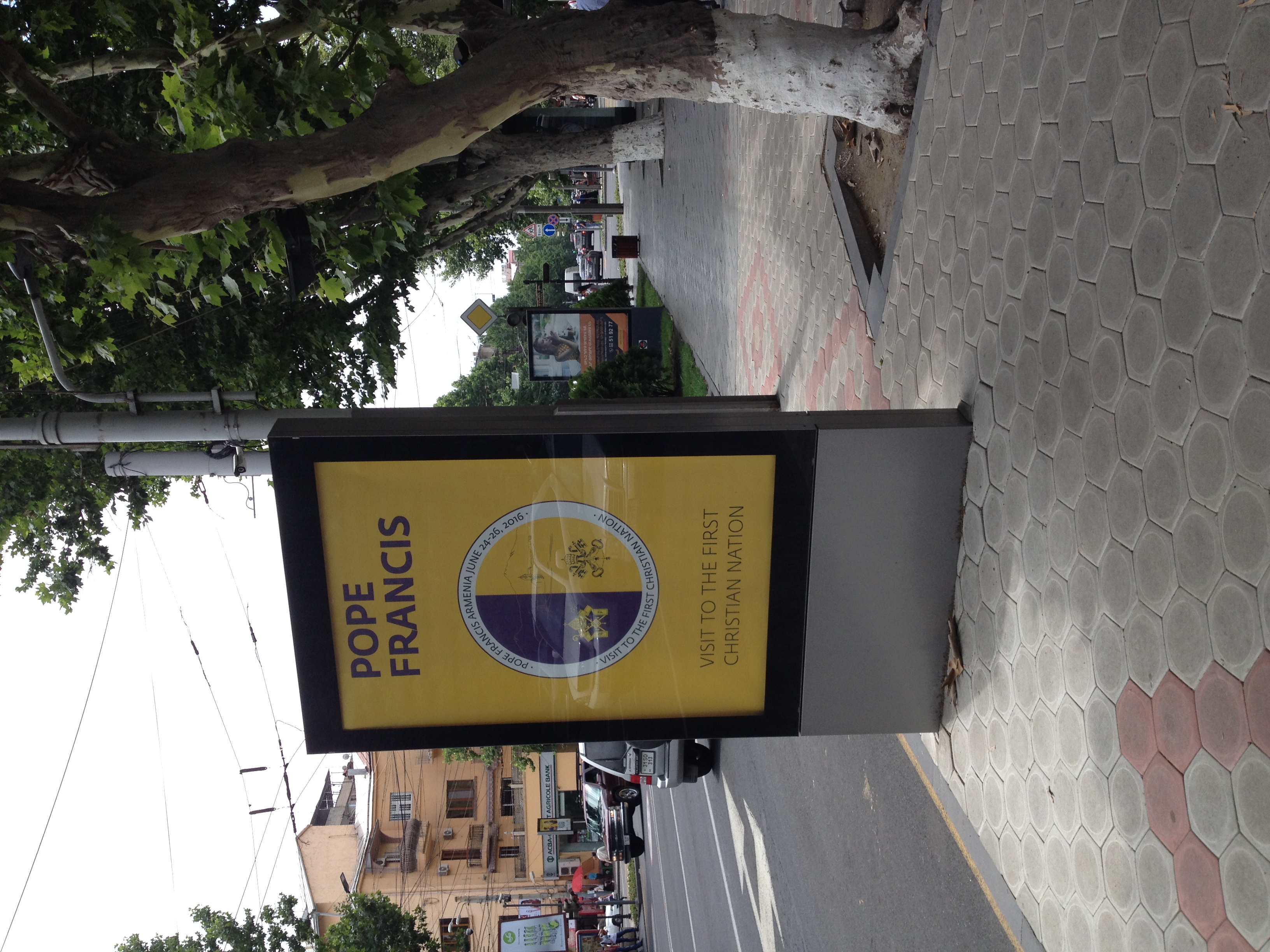 le lendemain à 9heures nous partons en voiture vers la place , pour la messe en plein air du Pape. Nous devons nous arrêter à quelques centaines de mètres et continuer à pied : la police a barré toutes les voies d'accès . Gendarmerie (Vostiganoutioun) , Police , et services secrets ,cernent la place .