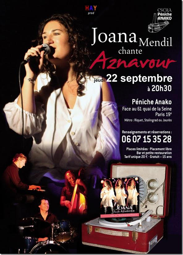 ARCHIVES Charles Aznavour chanté par Joana Mendil jeudi 22 septembre 2016 à 20h30 sur la péniche Anako face au 61 quai de la Seine 75019 Raffi September 10th, 2016 201622Anakochansonchansonschantecharles aznavourJeudiJoanaMendilpénicherue de Seineseptembre Joana Mendil chante Charles Aznavour sur la péniche Anako jeudi 22 septembre 2016 à 20heures 30 face au 61 quai de la Seine 75019 Paris résa : 06 07 15 35 28 Suivez-nous !