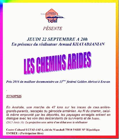 ARCHIVES “Les chemins arides” prix du meilleur documentaire , jeudi 22 septembre à 20 h Raffi September 17th, 2016 2016Apricotaridesaucheminscitédudu meilleur documentaireerevanfestivalGoldeGoldenim ErebouniKhayadjanianlesMétroprixrépubliquetartzaWauxhallyerevan Jeudi 22 septembre 2016 à 20 heures au Centre Culture 6 cité du Wauxhall 75010 Paris métro République entrée : participation libre "Les chemins arides" prix 2016 du meilleur documentaire au festival Golden Apricot Suivez-nous !