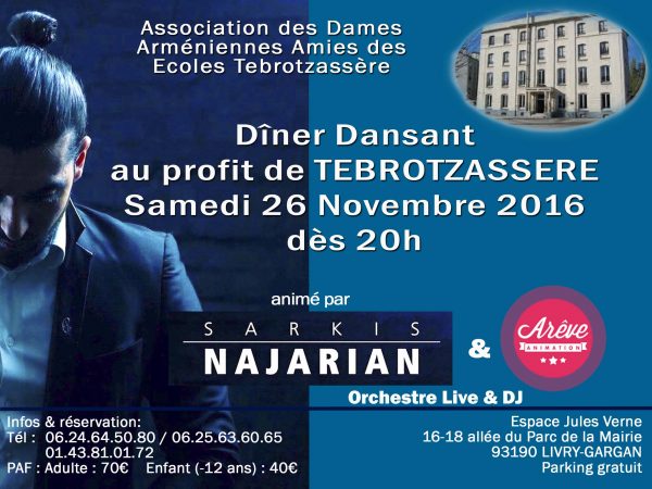 Dîner dansant samedi 26 novembre 2016 à partir de 20 heures :  espace Jules Verne 16-18 allée du Parc de la Mairie 93190 Livry Gargan parking gratuit