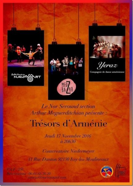 Jeudi 17 novembre 2016 à 20h30 : les ballets Navasart et Yeraz , la troupe du Medz Bazar, au Conservatoire Niedermeyer 11 rue Danton 92130 Issy Les Moulineaux resa : 06 61 68 76 20