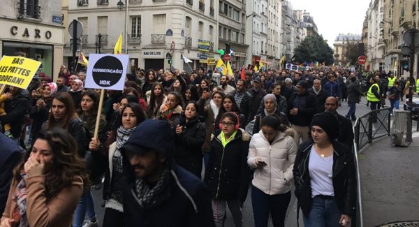 Environ 20.000 Kurdes ont manifesté samedi 5 novembre 2016, à partir de 15 heures dans les rues de la capitale française depuis la place de la République, contre les répressions et les purges visant leurs compatriotes en Turquie et orchestrées par le président turc Recep Tayyip Erdogan, pour protester notamment contre l'arrestation dans la nuit du 4 au 5 novembre de dirigeants et députés du Parti démocratique des peuples (HDP) .