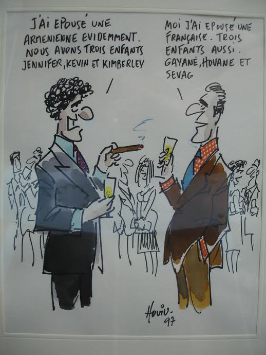 Hoviv, le célèbre caricaturiste de la presse française, s’est attaqué aux problèmes arméniens sur la fin de sa vie. Dans le dessin ci-dessous, il aborde la difficulté de maintenir son identité arménienne, notamment dans les mariages mixtes :