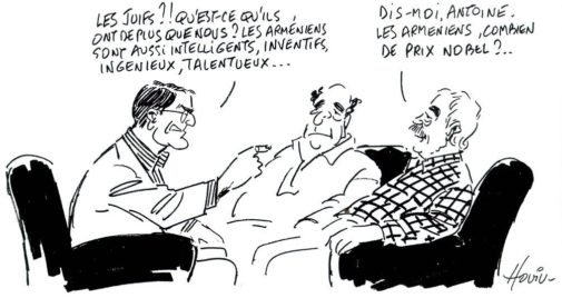 Dans un autre dessin, il soulève la question du nombre d’Arméniens détenteur de prix Nobel, en comparaison aux Juifs.