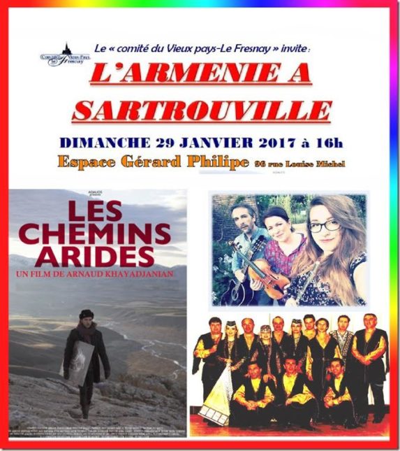 a 16 heures le dimanche 29 Janvier 2017 a l'Espace Gerard Philippe de Sartrouville ,rue Louise Michel, le comite du Vieux Pays-Le Fresnay prsente ; "les chemins arides , un film d'Arnaud Khayadjanian et de plus, des danses et des chants .