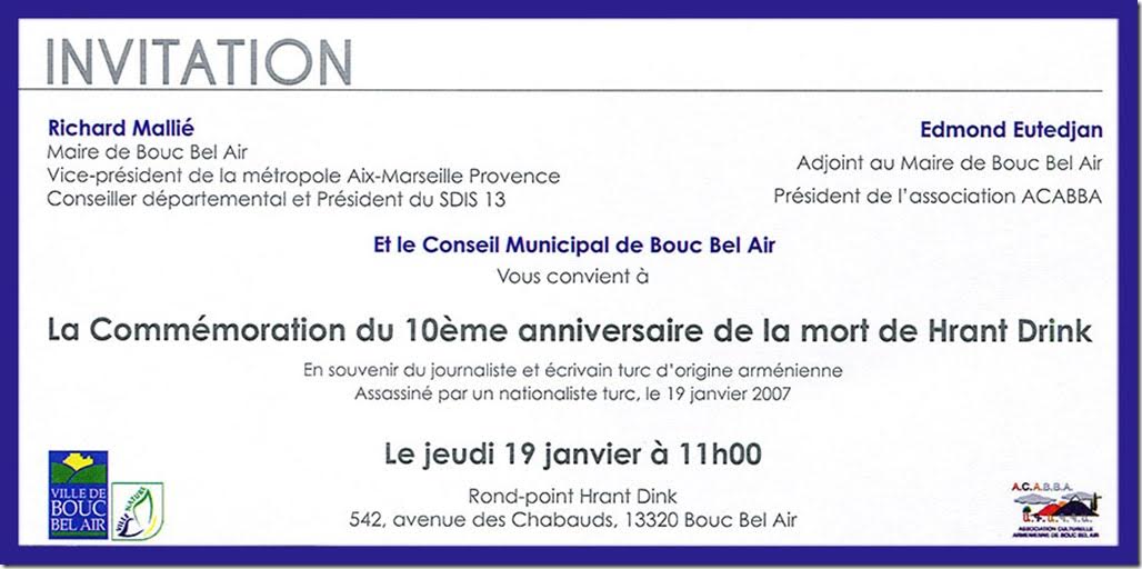 Commemoration du 10e anniversaire de l'assassinat de l'ecrivain et redacteur en chef du journal Agos , Hrant Dink , par un criminel turc a Bouc Bel Air , avec le maire et vice-president de la metropole Aix-Marseille Provence Richard Maille , conseiller departemental et President du SDIS 13