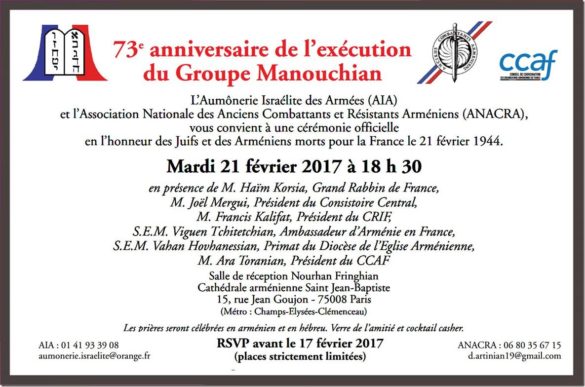 Le Groupe Manouchian ("l'Affiche rouge") a l'honneur avec la JAF, l'ANACR … le samedi 18 fevrier a 19 heures : Square Missak Manouchian boulevard Charles Livion Marseille 7eme , au cimetiere d'Ivry le dimanche 19 fevrier a 11 heures rassemblement a l'entree du cimetiere a 10h30 ;