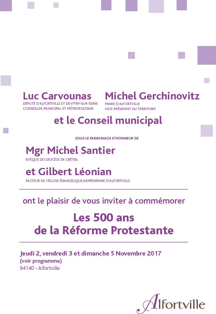 A partir du 2 Novembre , les Protestants fêtent la Réforme avec Mgr Michel Santier évêque du diocèse, Luc Cavournas député d'Alfortville et Vitry, et Michel Gerchinovitz, maire d'Alfortville , jusqu'au Dimanche 5 Novembre 2017, avec Gilbert Léonian pasteur de l'Eglise évangélique d'Alfortville ,