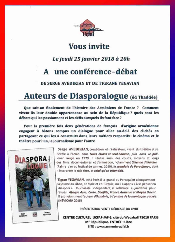 ARCHIVES Conference et debat a Paris jeudi 25 janvier 2018 a 20h avec le realisateur-acteur Serge Avedikian Raffi January 19th, 2018 arménienarménienscinémacultureeuropefrançaisfrancele mondeparisSerge Avédikian avec le realisateur-acteur ("Celui qu'on attendait") ,co-auteur du "Diasporalogue" aux editions Thadee Suivez-nous !