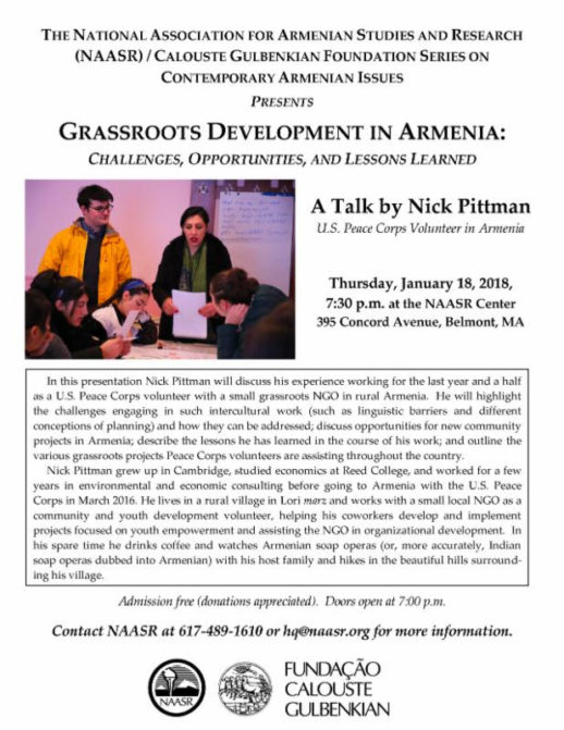 In this presentation Nick Pittman will discuss his experience working for the last year and a half as a U.S. Peace Corps volunteer with a small grassroots NGO in rural Armenia. He will highlight the challenges engaging in such intercultural work (such as linguistic barriers and different conceptions of planning) and how they can be addressed; discuss opportunities for new community projects in Armenia; describe the lessons he has learned in the course of his work; and outline the various grassroots projects Peace Corps volunteers are assisting throughout the country.