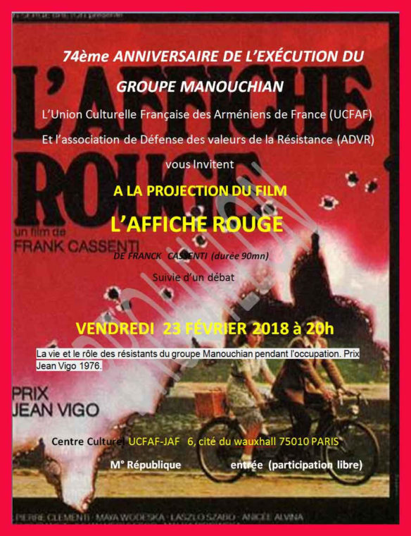 Raffi February 12th, 2018 arménienarméniennearméniensCassenticinémaconférencecultureeuropefrançaisfranceFrankJean Vigol'Affiche rougeparis