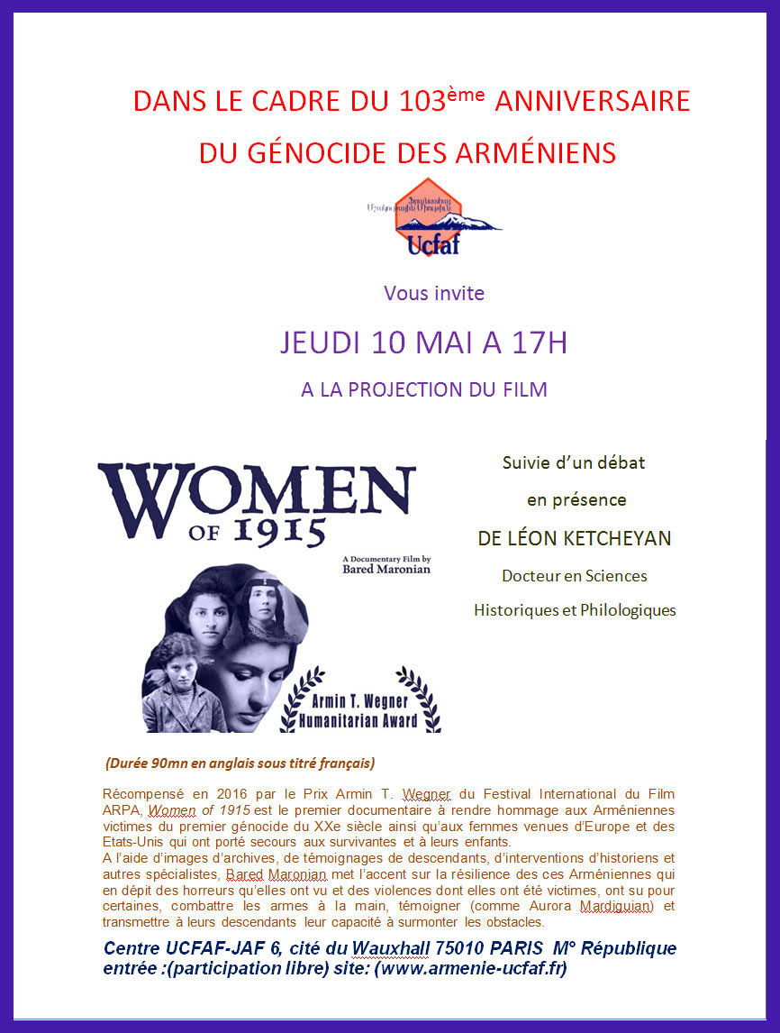 à Paris Jeudi 10 Mai 2018 à 17 heures : "Women in 1915" un documentaire sur les Femmes du gé–nocide