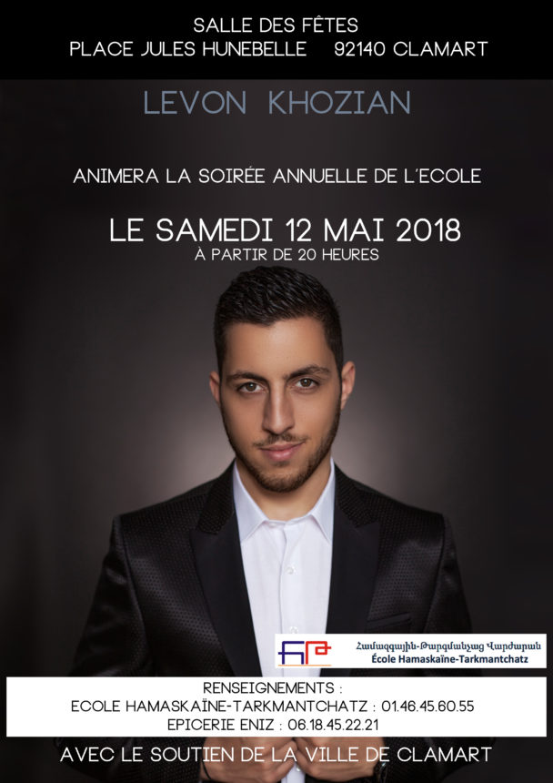 ARCHIVES Hamaskaïne -Tarkmantchatz présentent samedi 12 Mai 2018 à partir de 20 heures : Raffi March 30th, 2018 92140 ClamartdesfêtesHunnebelleplacesallespectacle 12 Mai 2018 : Gala annuel de l'Ecole Tarkmantchatz à partir de 20 heures avec le soutien de la mairie de Clamart, salle Hunnebelle à Clamart (92): Résa 01 46 45 60 55 et Epicerie Eniz à Clamart source : Stéphane Aslanian Suivez-nous !