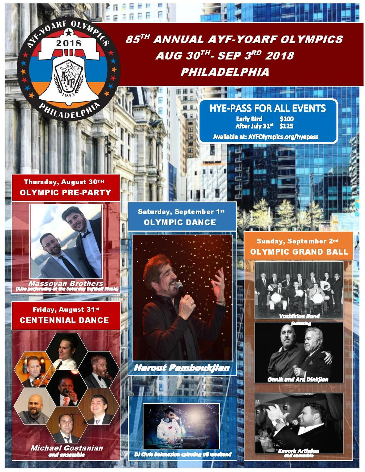 Your to-do list for the 85th Annual AYF-YOARF Olympics in Philly!1. Get your HyePass at ayfolympics.org/hyepass/ for $125 and save $50 on the dances!!! 2. Get your Ad Book form in at ayfolympics.org/adbook/! 3. Sign up for Alumni Golf Friday morning at ayfolympics.org/alumnigolf/ 4. If you're one of the few people who haven't booked your room – book at ayfolympics.org/ – there are a few double rooms left! |
