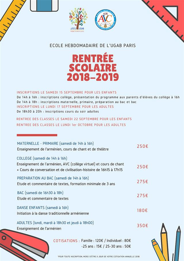 ARCHIVES “Donne-moi ta main et prends la mienne”(Sheila) : l’école n’est jamais finie , inscriptions le 5 et 7 septembre 2018 Raffi June 27th, 2018 'EconomiearménienculturefrançaisfranceparisugabUGAB Ile de France Ecole hebdomadaire de l'UGAB : rentrée scolaire 2018-2019 inscriptions samedi 15 et lundi 17 septembre 2018 118 rue de Courcelles 75017 Paris métro Courcelles source : UGAB Suivez-nous !