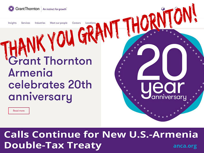 "The ANCA welcomes Grant Thornton's full support for a US-Armenia Double Tax Treaty," remarked ANCA Chairman Raffi Hamparian. "We look forward to the U.S. Treasury Department engaging with the Republic of Armenia – without delay – to conclude this much-needed accord," Hamparian added.