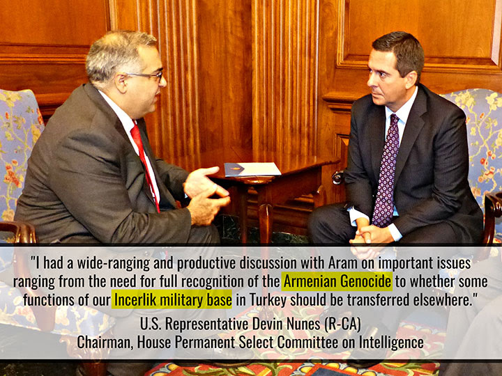 "I had a wide-ranging and productive discussion with Aram on important issues ranging from the need for full recognition of the Armenian Genocide to whether some functions of our Incirlik military base in Turkey should be transferred elsewhere," said Chairman Nunes, following the meeting.