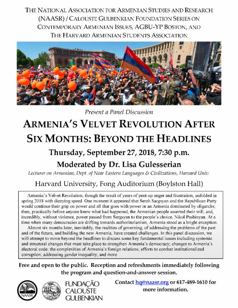Le 27 septembre 2018 à 19h30 (7h30 pm) : conference : l'Arménie , 6 mois après la Révolution de velours