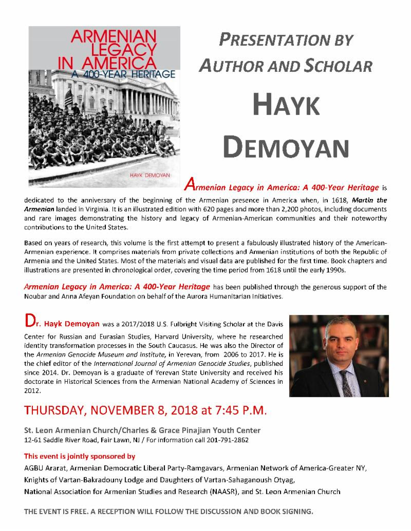 This event is jointly sponsored by AGBU Ararat, Armenian Democratic Liberal Party-Ramgavars, Armenian Network of America-Greater NY, Knights of Vartan-Bakradouny Lodge and Daughters of Vartan-Sahaganoush Otyag, National Association for Armenian Studies and Research (NAASR), and St. Leon Armenian Church