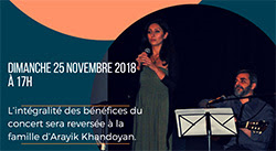 Les deux chanteurs Areg Nazarian et Anoush Terterian, tout droit venus de Belgique et de passage exceptionnel à Paris, présentent un répertoire engagé aux mélodies harmonieuses. Leurs voix seront accompagnées de leurs propres instruments, Areg à la guitare et Anoush au violon. L'integralité des bénéfices du concert sera reversée à la famille d'Arayik Khandoyan.