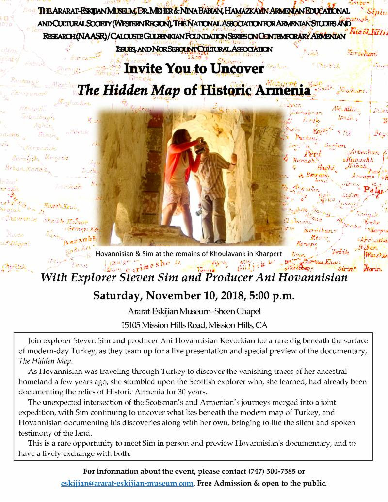 Saturday, November 10, 5:00 p.m.: "Uncovering The Hidden Map of Historic Armenia" with Steven Sim and Ani Hovannisian, at Ararat-Eskijian Museum–Sheen Chapel, 15105 Mission Hills Road, Mission Hills, CA. Join explorer Steven Sim and producer Ani Hovannisian for a rare dig beneath the surface of modern-day Turkey, as they come together for a live presentation and special advance preview of the documentary, The Hidden Map. Co-sponsored by the Ararat-Eskijian Museum, Dr. Meher & Nina Babian, Hamazkayin …
