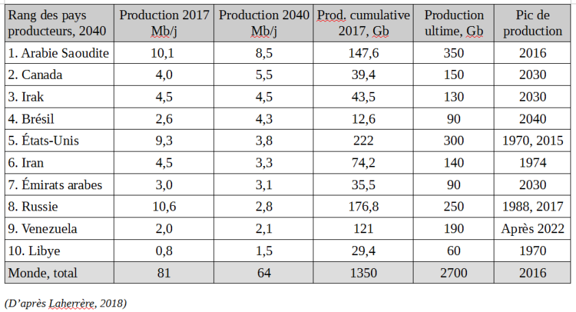 Le taux de déclin des autres pays sera de 5 % par an en moyenne et la production mondiale a plafonné dès 2016. Ce sont là les principaux résultats .