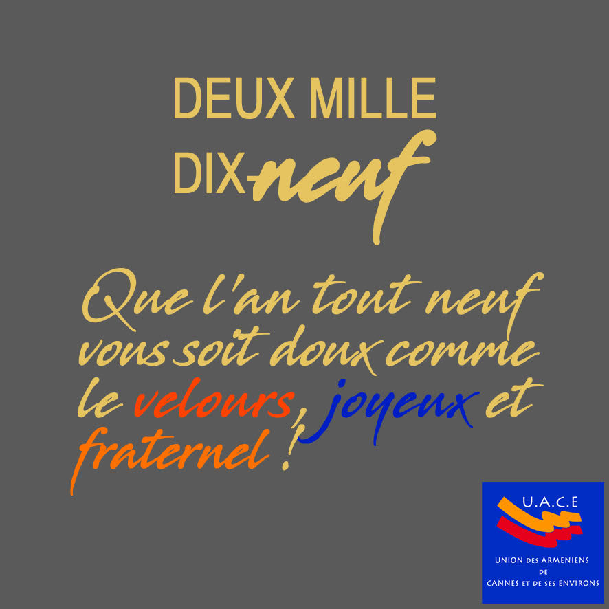 ARCHIVES Les Voeux de l’UACE , association de la Côte d’Azur Raffi January 2nd, 2019 'Economiearmeniearménienarméniennearménienscannescinéma l'UACE , assocaition de Cannes et des Environs (la Côte d'Azur) souhaite que 2019 soit doux comme le velours ,joyeux et fraternel source :UACE Suivez-nous !