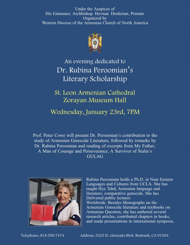 "ire le nouvel ouvrage de Rubina Peroomian n’est ni facile, ni agréable. Or c’est nécessaire et hautement gratifiant. Ce livre, son troisième sur ce sujet, traite des images du génocide arménien dans la littérature. Son premier ouvrage sur ce thème était Literary Responses to Catastrophe : A Comparison of the Armenian and the Jewish Experience [Réactions littéraires à la catastrophe : comparaison entre l’expérience arménienne et juive] (Scholars Press, 1993) et le second était And Those Who Continued Living in Turkey after 1915 : The Metamorphosis of the Post-Genocide Armenian Identity as Reflected in Artistic Literature [Et ceux qui continuèrent à vivre en Turquie après 1915 : reflets de la métamorphose de l’identité arménienne de l’après-génocide dans la littérature artistique] (Erevan : Musée-Institut du Génocide Arménien, 2008, récemment réédité avec une préface de Richard Hovannissian]. Son objectif n’est pas de prouver que le génocide a eu lieu, ce dont les historiens ont déjà attesté. Cette œuvre puissante, qu’elle définit comme « un cri de protestation contre l’inhumanité de l’homme envers l’homme » (p. xiv), vise plutôt à « exposer la dimension humaine du crime » (p. xv) et, ce faisant, à aider les Arméniens de seconde et troisième générations à aborder au plan psychologique le traumatisme qui leur a été transmis par leurs ascendants. Elle s’inclut elle-même très directement dans cette catégorie. A l’âge tendre de six ans, elle subit la perte de son père, professeur de chimie à Tabriz, qui fut liquidé un soir par le NKVD soviétique en tant que dirigeant de l’opposition nationaliste arménienne. C’est cette expérience qui a contribué à sa décision de s’informer sur la tragédie qui frappa le peuple arménien. Lire cette volumineuse littérature fut une expérience douloureuse qui imprima sa marque sur sa psyché. « J’aimerais croire, écrit-elle, que le résultat que je produirai avec mon travail me guérira de mon tumulte psychologique. Je prie pour une prompte guérison, que serait l’achèvement imminent de ma recherche » (p. xvi).