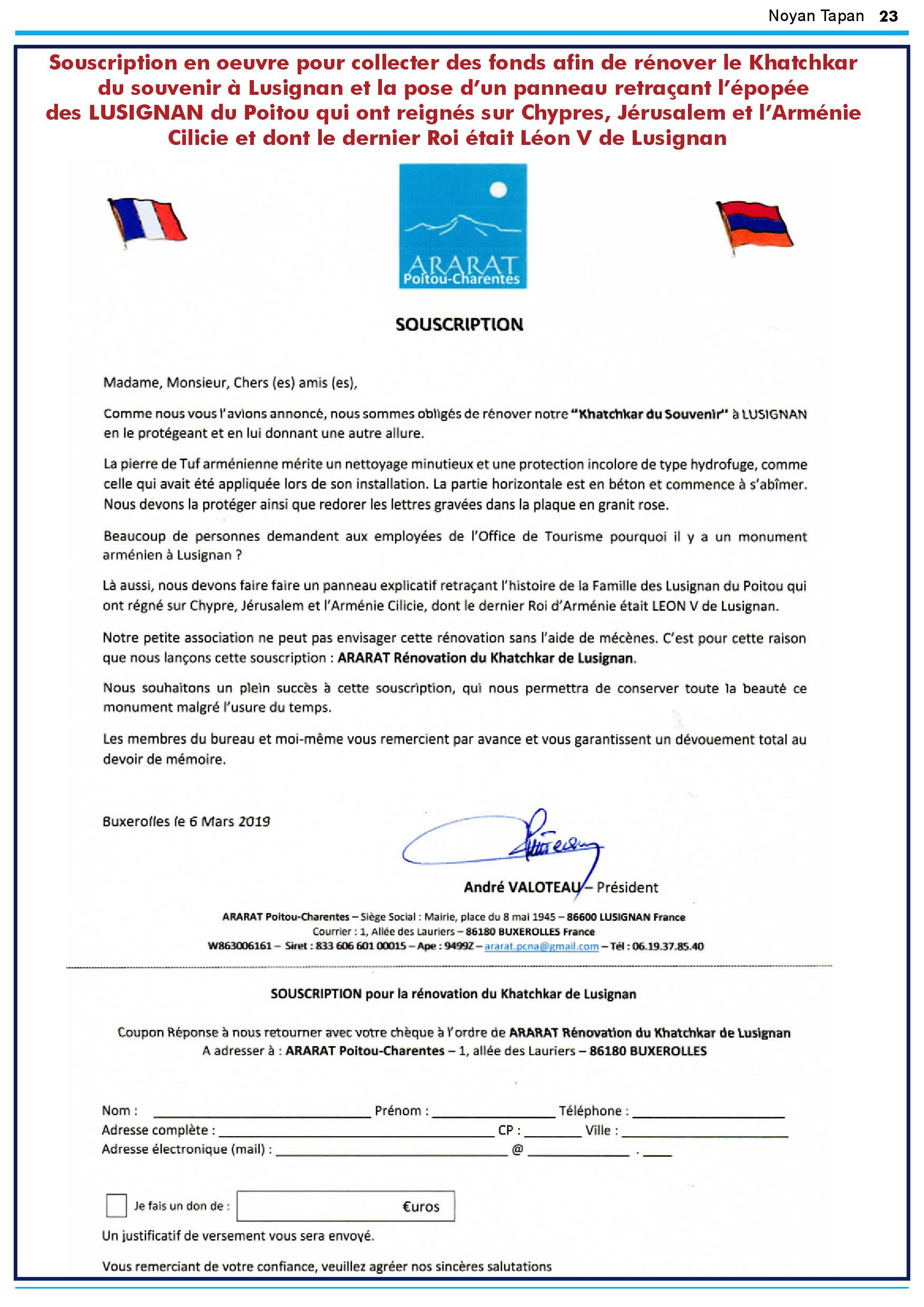Souscription par chèque à l'ordre de "Ararat rénovation du Khatchkar de Lusignan" à poster à : Ararat Poitou Charente , 2 allée des Lauriers 86180 Buxerolles