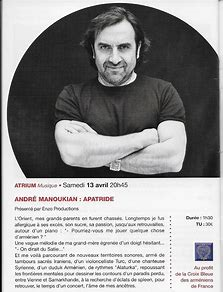 APATRIDE. "L’Orient, mes grands-parents en furent chassés. Longtemps je fus allergique à ses excès, son sucre, sa passion, jusqu’aux retrouvailles, autour d’un piano : « – Pourriez-vous me jouer quelque chose d’arménien ? » Une vague mélodie de ma grand-mère égrenée d’un doigt hésitant… « – On dirait du Satie… » Et me voilà parcourant de nouveaux territoires sonores, armé de tambours sacrés Iraniens, d’un violoncelliste Turc, d’une chanteuse Syrienne, d’un duduk Arménien, de rythmes « Alaturka », repoussant les frontières mentales pour dessiner les contours d’un paradis perdu, entre Vienne et Samarkhande, à la recherche d’éclats de spleen, pour retrouver, le temps d’un concert, l’âme de mes ancêtres.