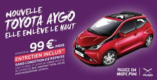 (1) Exemple pour une Toyota Aygo x-play x-touch 3 portes neuve au prix exceptionnel de 10 200 €, remise de 2 250 € déduite. LOA* 37 mois, 1er loyer de 1 750 €, suivi de 36 loyers de 99 €/mois hors assurances facultatives. Option d’achat : 6 113 € dans la limite de 37 mois & 30 000 km.