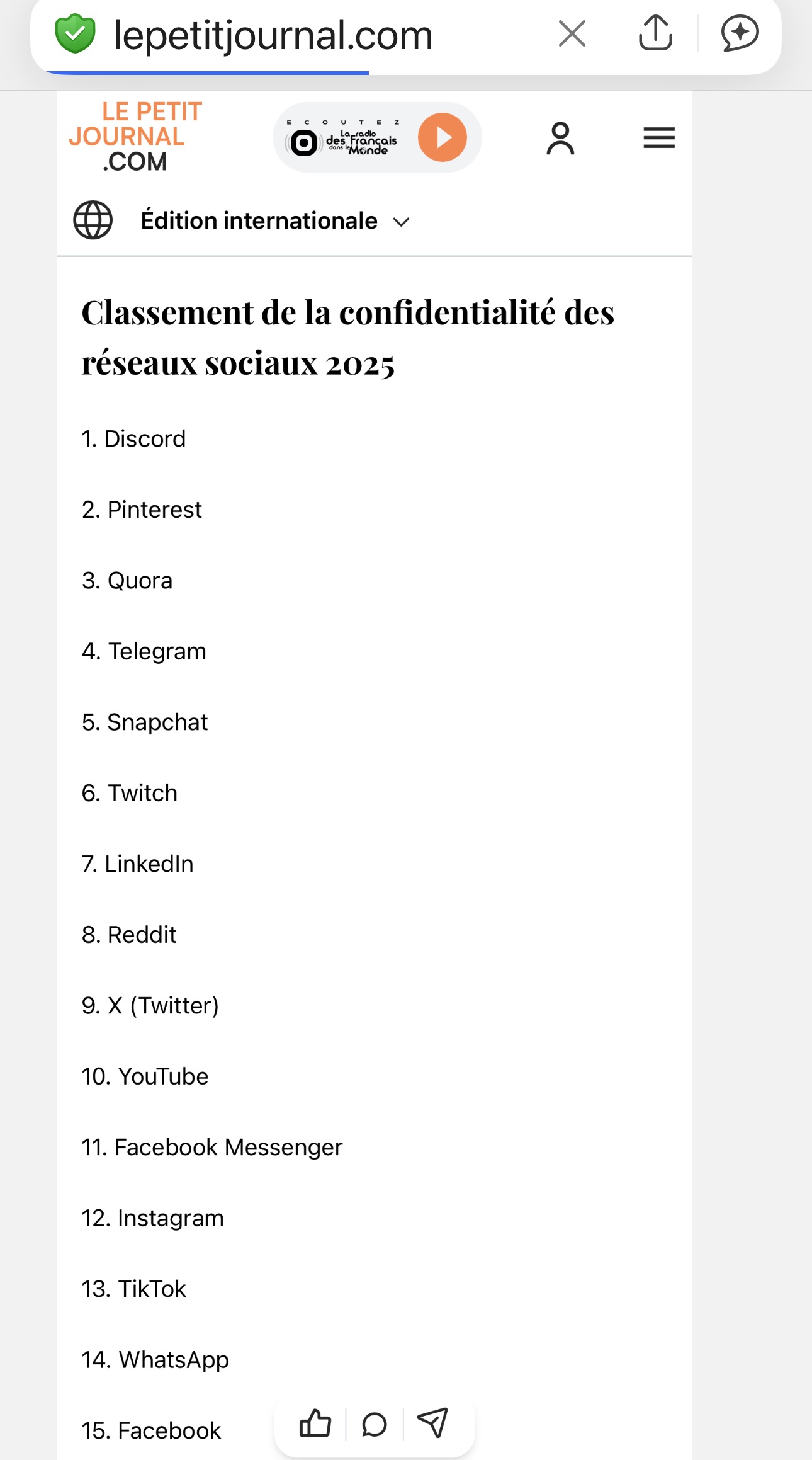 Alors qu’il est considéré comme l’un des pionniers des réseaux sociaux, le groupe META n’est pas à la pointe en termes de confidentialité. Et pourtant, META mène une domination sans partage en France. Selon le Digital Report France 2025, le groupe de Mark Zuckerberg occupe les 4 premières places du top 10 des réseaux sociaux les plus utilisés en 2024. On y retrouve respectivement Facebook en tête, suivi par WhatsApp, Instagram et pour finir Messenger. Ces statistiques mettent en lumière une question qui semble évidente : Pourquoi utilisons-nous autant des réseaux sociaux qui ne sont pas à la pointe en ce qui concerne la confidentialité ? À cette question, l’hypothèse de la force de l’habitude paraît être la réponse la plus plausible.